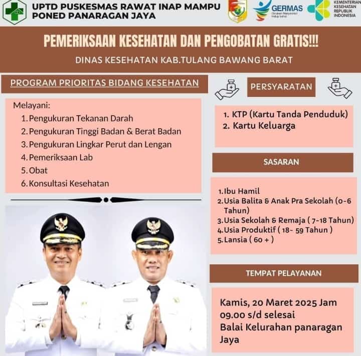 Tulang Bawang Barat – Pemerintah Kabupaten Tulang Bawang Barat (Tubaba) menggelar kegiatan pengobatan gratis serentak di beberapa lokasi di wilayah Tubaba. Kegiatan ini bertujuan untuk meningkatkan kesehatan masyarakat dan memberikan akses pengobatan yang mudah dan gratis.