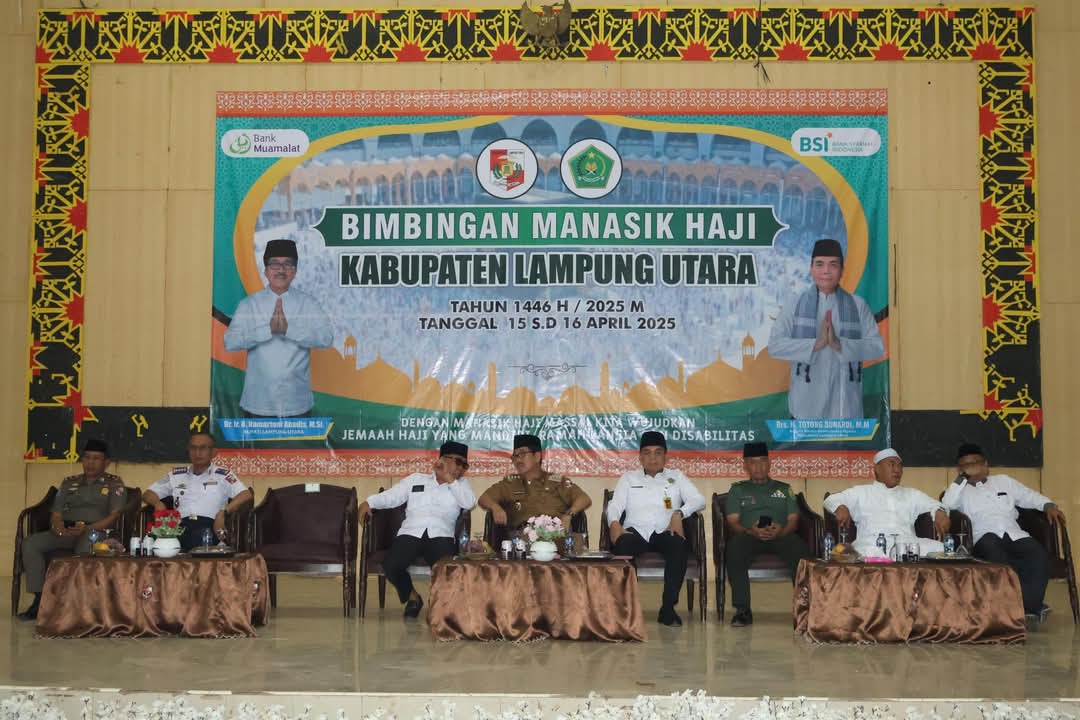 Bupati Lampung Utara, Dr. Ir. Hamartoni Ahadis , M.Si, secara resmi membuka kegiatan Bimbingan Manasik Haji Kabupaten Lampung Utara Tahun 1446 H / 2025 M yang diselenggarakan di Gedung Serba Guna (GSG) Islamic Centre Kotabumi, Selasa (15/4/2025).