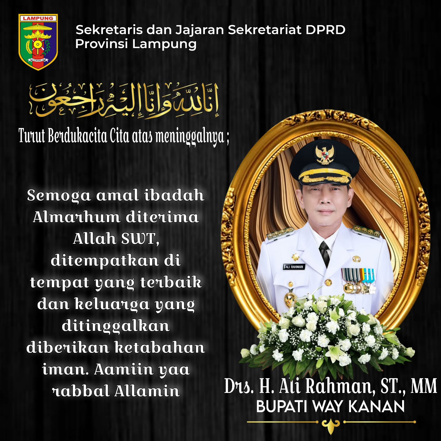 Sekretaris DPRD Provinsi Lampung beserta Jajaran Sekretariat DPRD Provinsi Lampung turut berduka cita atas meninggalnya Bupati Way Kanan, Bapak Drs. Ali Rahman, ST., MM.