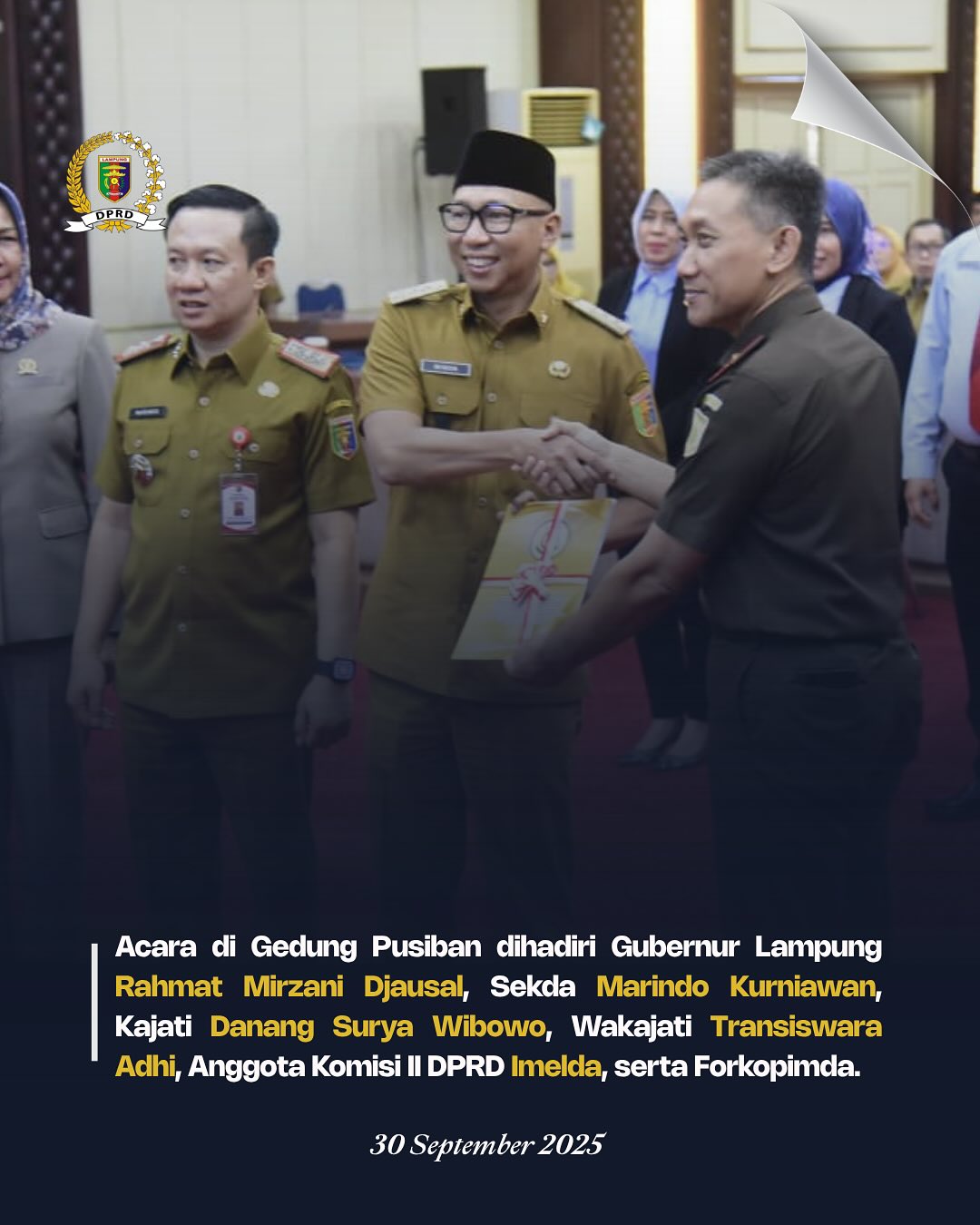 Bandar Lampung, 30 September 2025 – DPRD Provinsi Lampung bersama Pemerintah Provinsi Lampung melaksanakan penyerahan Berita Acara Kesepakatan Bersama atas tindakan hukum lain oleh Jaksa Pengacara Negara terhadap pemulihan Barang Milik Daerah Provinsi Lampung di PPI Kalianda, Muara Piluk dan Ketapang dari Kejaksaan Tinggi Lampung.