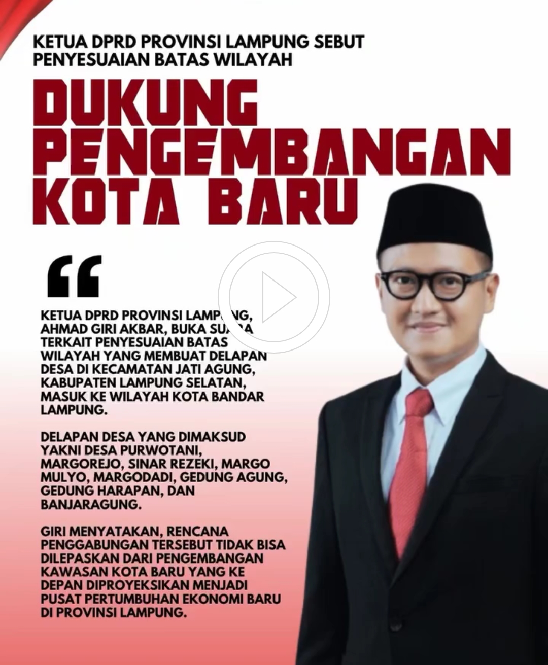 LAMPUNG- Ketua DPRD Provinsi Lampung, Ahmad Giri Akbar, buka suara terkait penyesuaian batas wilayah yang membuat delapan desa di Kecamatan Jati Agung, Kabupaten Lampung Selatan, masuk ke wilayah Kota Bandar Lampung.