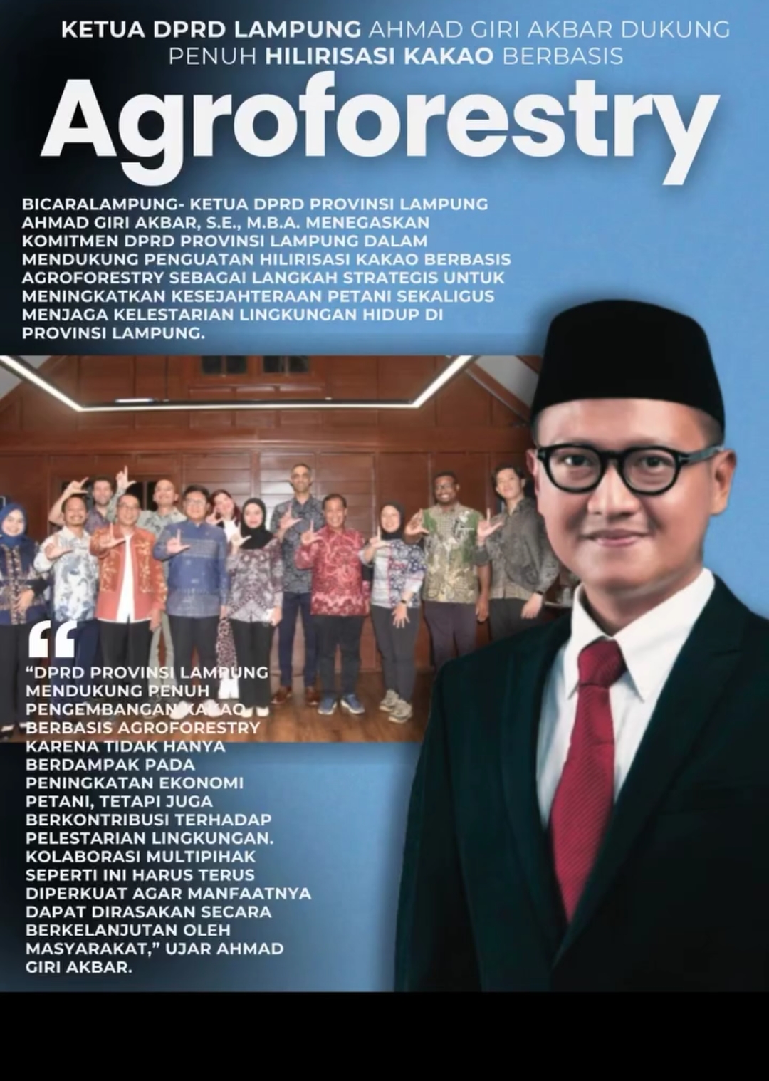 “DPRD Provinsi Lampung mendukung penuh pengembangan kakao berbasis agroforestry karena tidak hanya berdampak pada peningkatan ekonomi petani, tetapi juga berkontribusi terhadap pelestarian lingkungan. Kolaborasi multipihak seperti ini harus terus diperkuat agar manfaatnya dapat dirasakan secara berkelanjutan oleh masyarakat,” ujar Ahmad Giri Akbar.