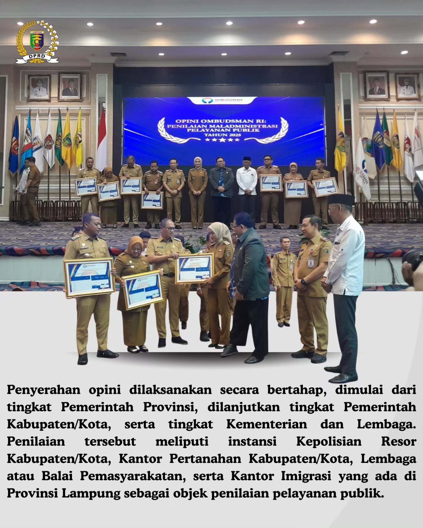 Bandar Lampung — Dewan Perwakilan Rakyat Daerah (DPRD) Provinsi Lampung menghadiri kegiatan Penyerahan Opini Ombudsman Republik Indonesia atas Penilaian Maladministrasi Pelayanan Publik Tahun 2025 yang diselenggarakan oleh Ombudsman Republik Indonesia Perwakilan Provinsi Lampung, bertempat di Balai Keratun Lantai III, Kantor Gubernur Provinsi Lampung, Senin (9/2/2025).