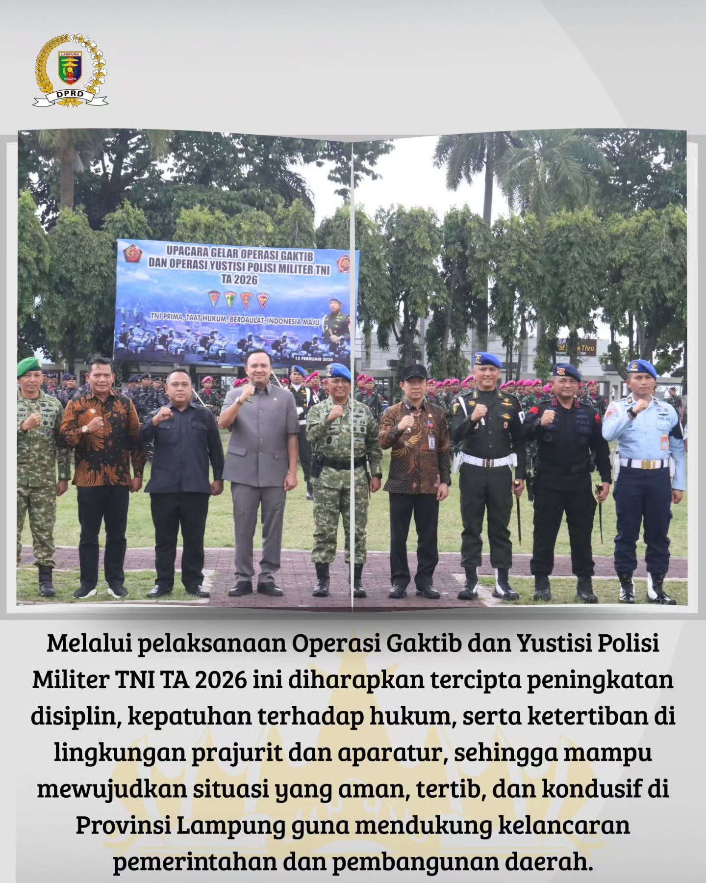 Bandar Lampung — Ketua Komisi I DPRD Provinsi Lampung, Garinca Reza Pahlevi, S.I.Kom., M.M., menghadiri Upacara Gelar Operasi Penegakan Ketertiban (Gaktib) dan Yustisi Polisi Militer TNI Tahun Anggaran 2026 yang dilaksanakan di Lapangan Korpri Komplek Kantor Gubernur Lampung, Jumat (13/2/2026).