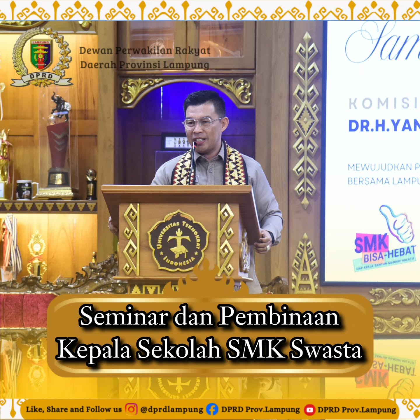 “Kami dari Komisi V DPRD Provinsi Lampung sangat mendukung upaya-upaya peningkatan mutu pendidikan di SMK. Melalui seminar dan pembinaan ini, diharapkan para Kepala Sekolah dapat meningkatkan kemampuan manajerialnya, sehingga mampu mengelola sekolah dengan lebih efektif dan efisien,” ujar Yanuar Irawan.