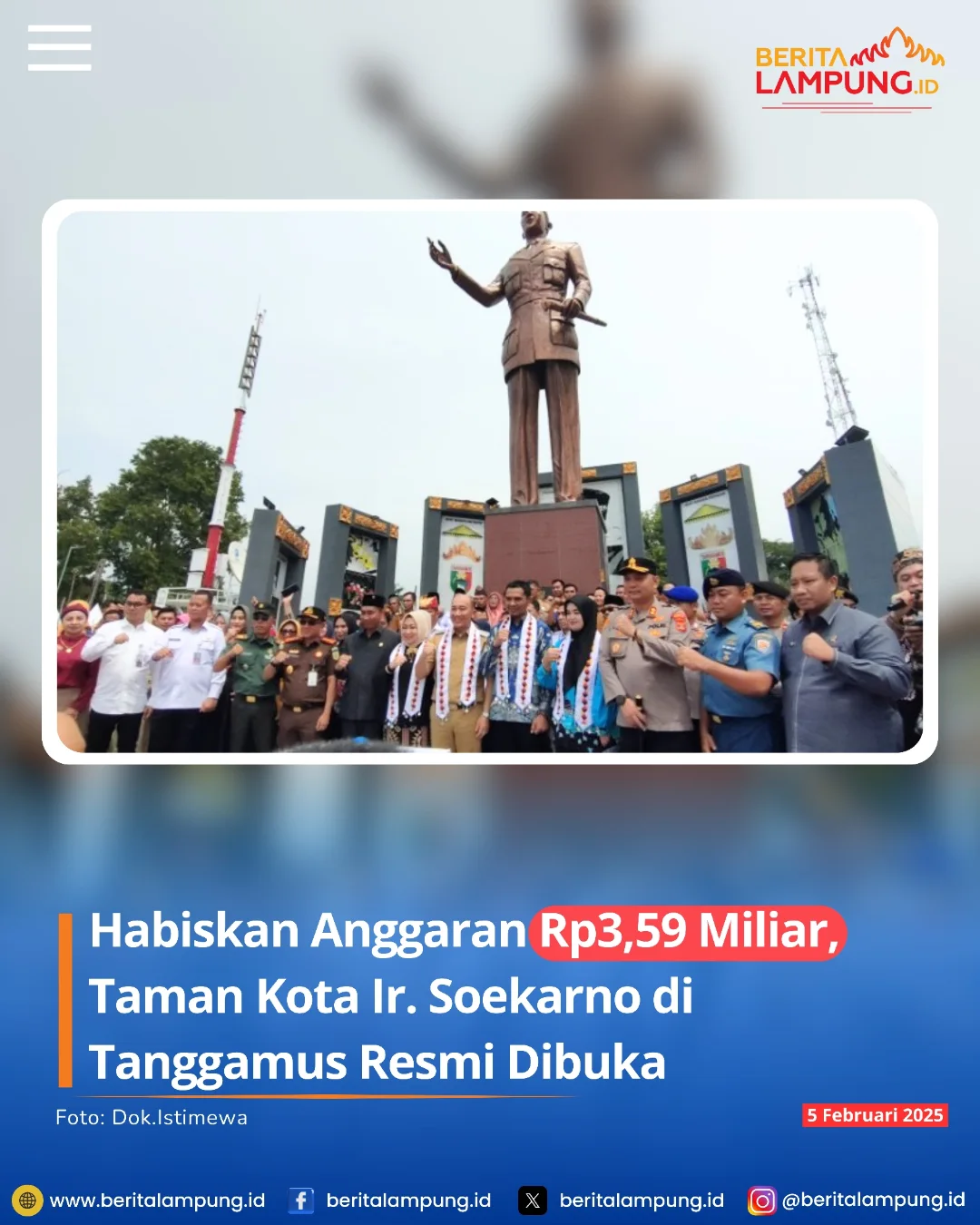 Tanggamus – PJ Bupati Tanggamus Mulyadi Irsan Meresmikan Taman Kota Ir. Soekarno di Kabupaten Tanggamus, pada Senin (3/2/2025). Menelan anggaran sebesar Rp3,59 miliar yang bersumber dari APBD Kabupaten Tanggamus Tahun 2024. Taman kumuh ini mengalami renovasi besar-besaran.