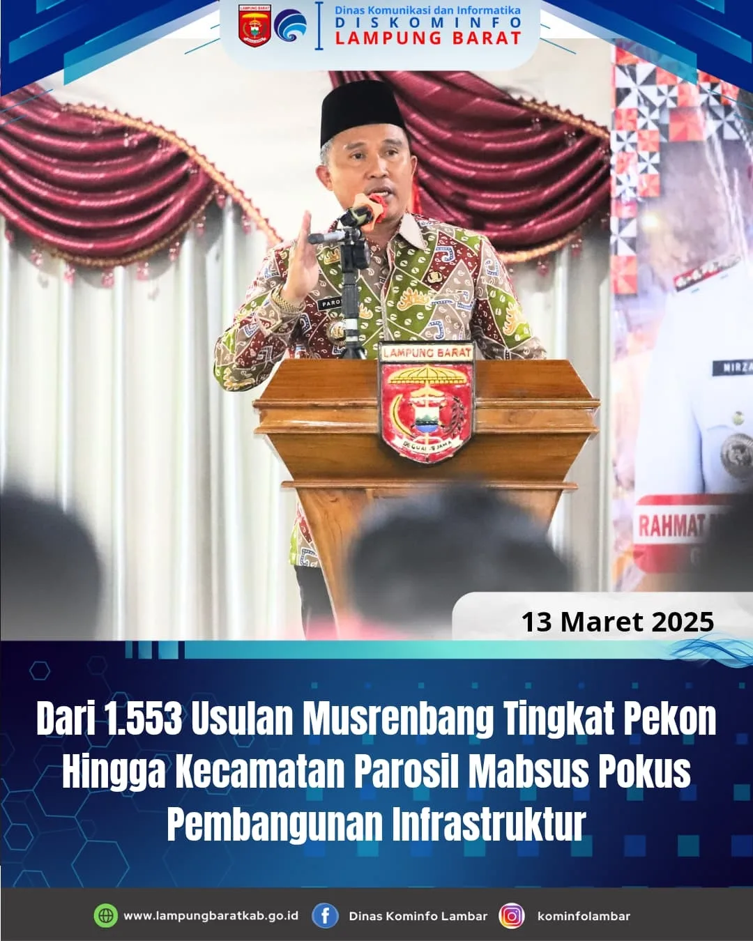 Sebanyak 1.553 usulan yang disampaikan masyarakat pada pelaksanaan Musrenbang tingkat kecamatan, Bupati Lampung Barat Parosil Mabsus menegas bahwa pembangunan Infrastruktur dan peningkatan kualitas hidup masyarakat tetap menjadi sekala prioritas utama Perintah Kabupaten Lampung Barat.