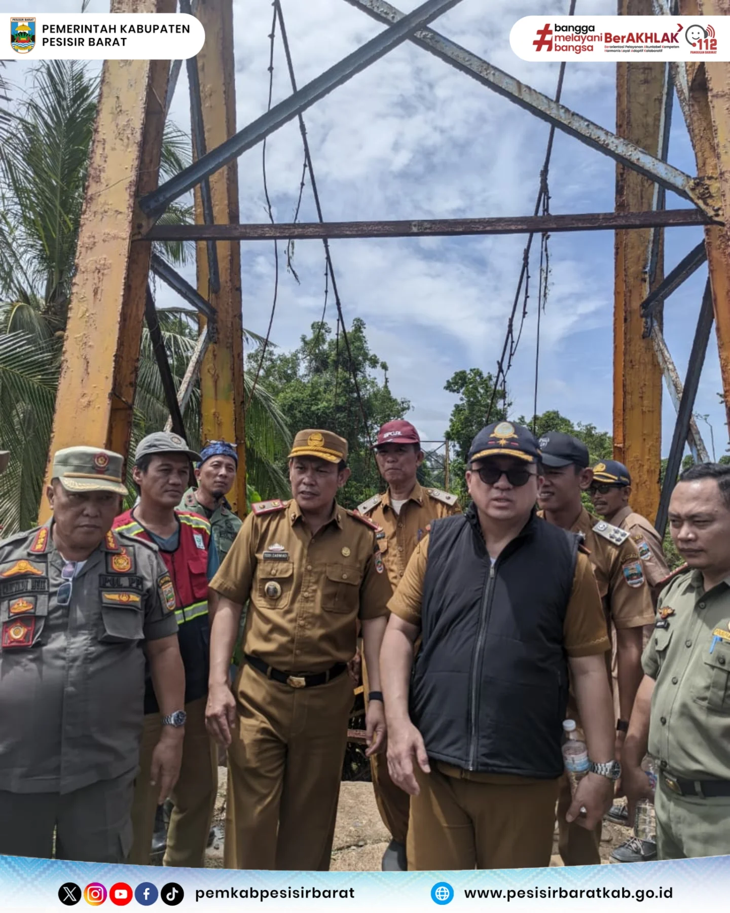 Pj. Sekretaris Daerah (Sekda) Pesibar, Tedi Zadmiko, didampingi oleh Balai Besar Taman Nasional Bukit Barisan Selatan (BBTNBBS) dan sejumlah pejabat terkait, melakukan peninjauan langsung ke lokasi jembatan yang rusak parah tersebut pada Senin (14/10/2025).