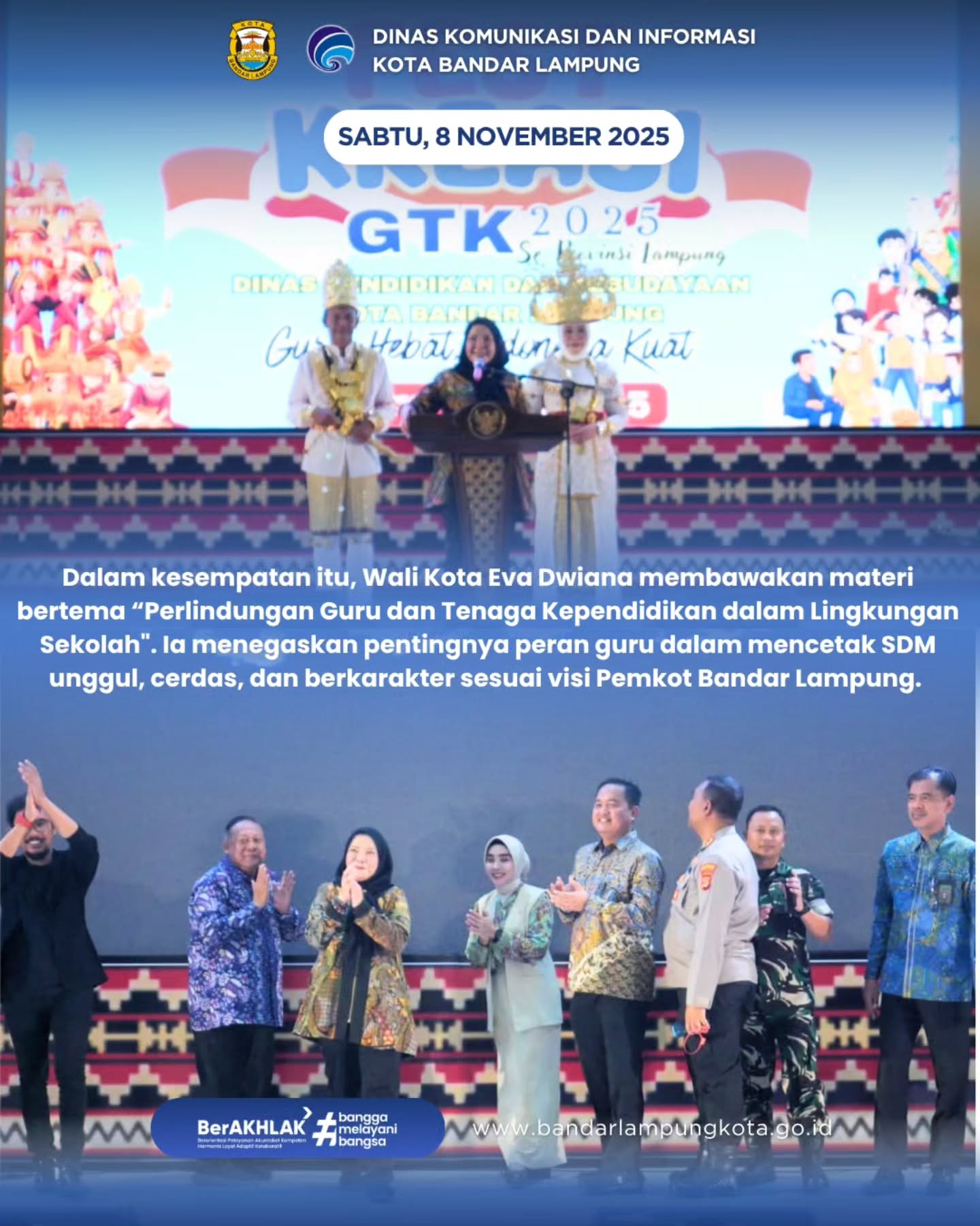 Bandar Lampung, 8 November 2025 – Wali Kota Bandar Lampung, Hj. Eva Dwiana, menjadi narasumber dalam Festival Kreasi Guru dan Tenaga Kependidikan (GTK) yang diselenggarakan oleh Balai Guru dan Tenaga Kependidikan Provinsi Lampung di Gedung Graha Mandala.