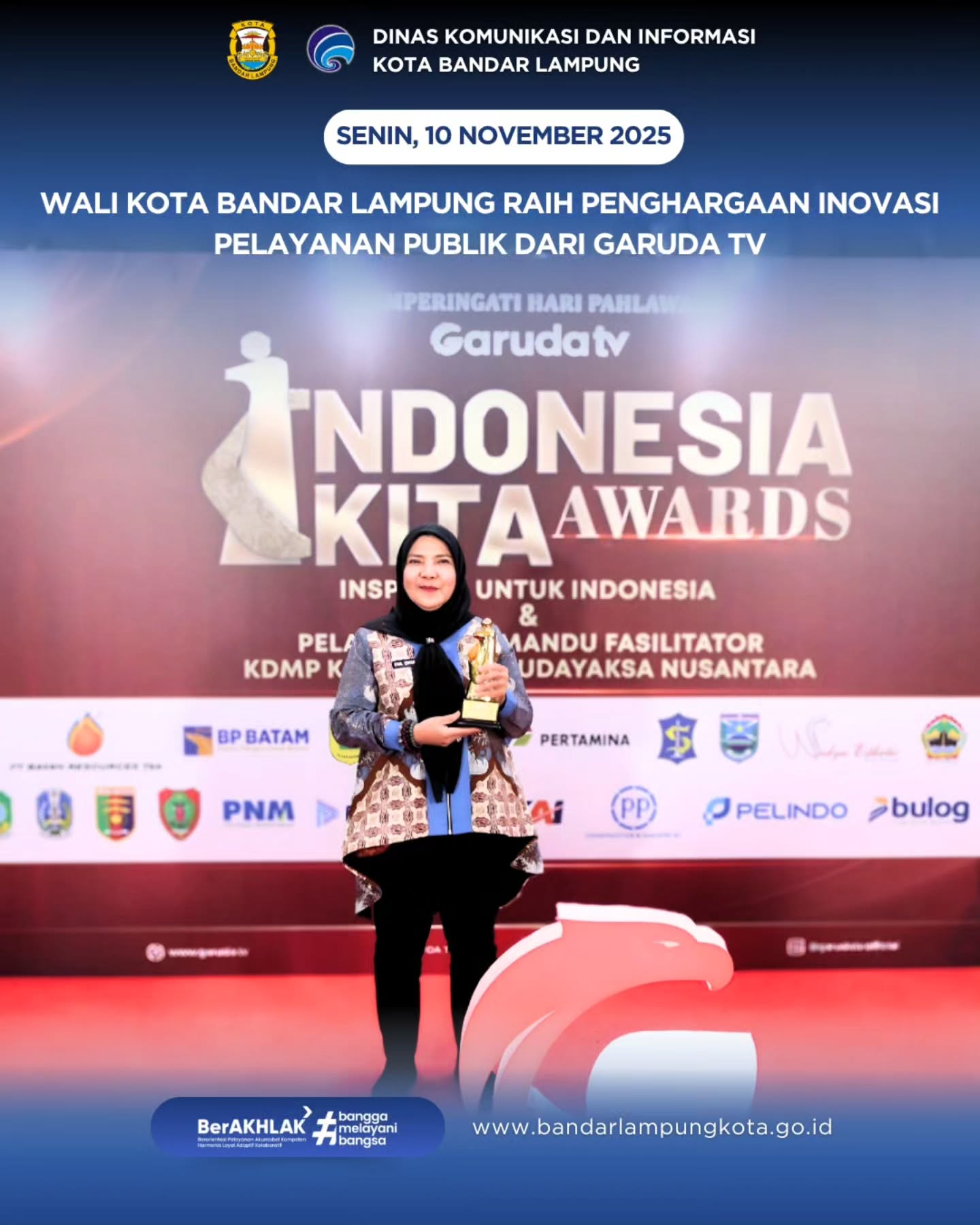 Jakarta – Wali Kota Bandar Lampung, Hj. Eva Dwiana, menerima penghargaan “Excellence in Public Service Innovation” dalam ajang Indonesia Kita Awards 2025 yang digelar oleh Garuda TV di Patra Jasa Office Tower, Jakarta, Senin (10/11/2025).