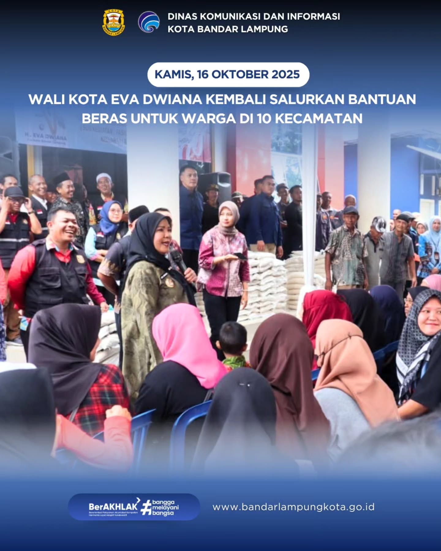 Bandar Lampung – Wali Kota Bandar Lampung, Hj. Eva Dwiana, kembali menyalurkan Bantuan Sosial Kesejahteraan Keluarga berupa beras kepada masyarakat di 10 kecamatan, Kamis (16/10/2025).